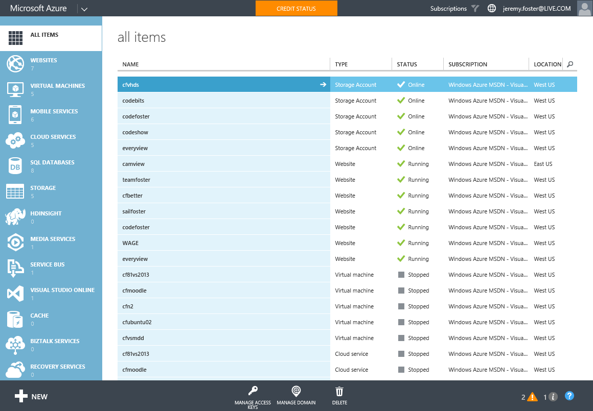 To get to the main, full-featured, current Azure portal, you browse to manage.windowsazure.com in any modern browser, and it looks like this…