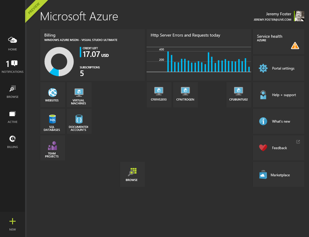 The new portal is already available for you to play with and get familiar with, and it’s a good thing too since it takes quite a bit of getting used to. Once you grok it, though, I’m pretty sure you’ll like it better. You get to the new portal by browsing to portal.azure.com. Here’s what it looks like…