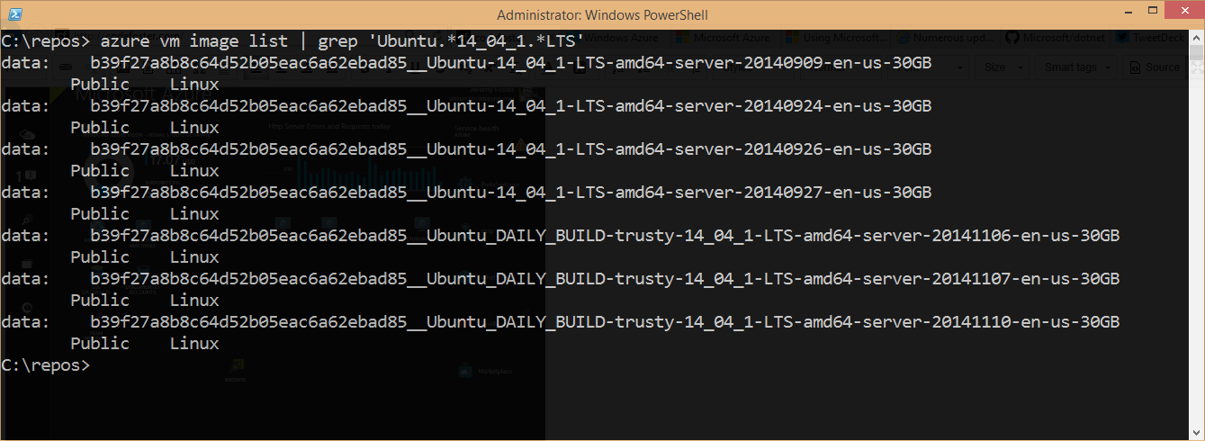The following will generate a list of Azure VM images and allows me to pipe to a regular expression to pull out just the stable (LTS) Ubuntu images of a certain version (14.04.1). It’s also possible to add a --json property to the request and get this data back in JSON format.