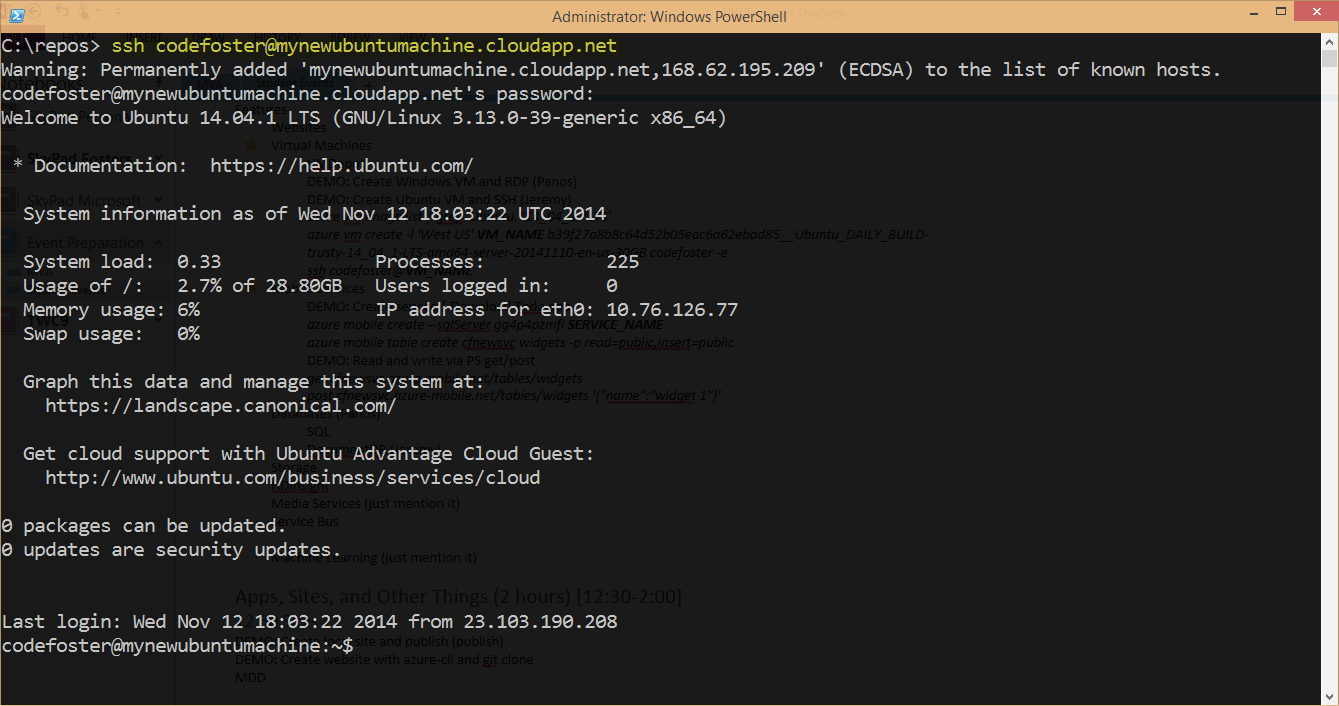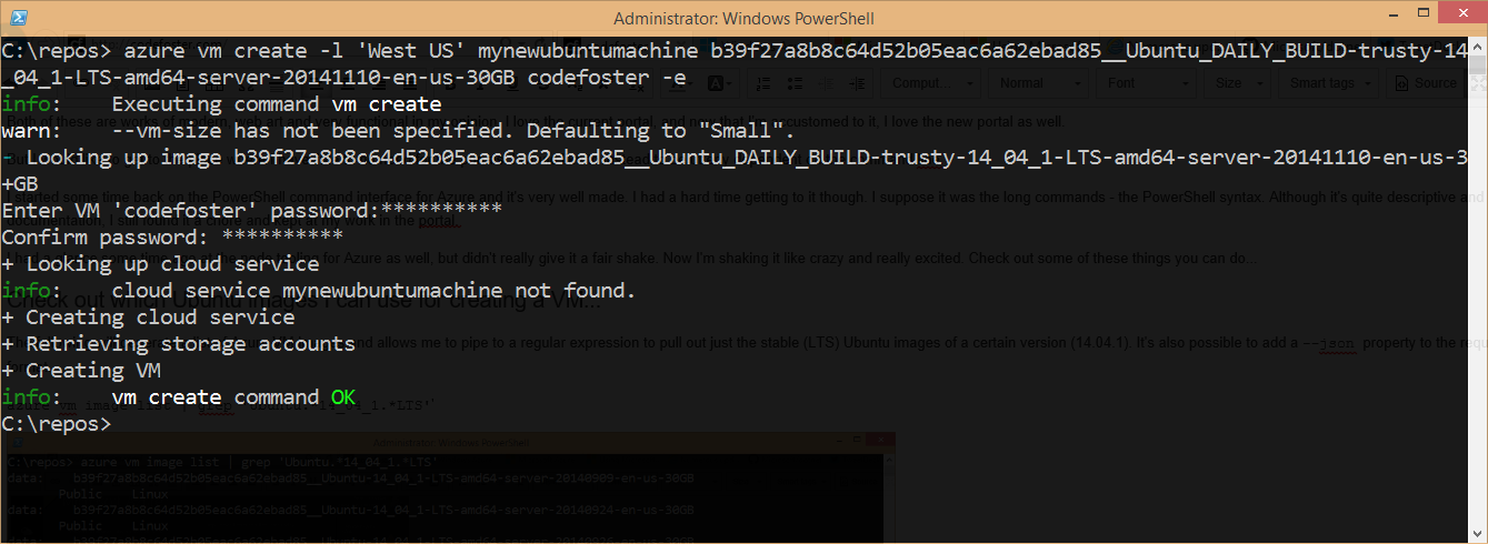 Once I’ve chosen the image I want to start with, I simple call the following to create a new VM in the West US region. I add the -e parameter to add ssh capability so I can ssh into the machine when it’s finished.