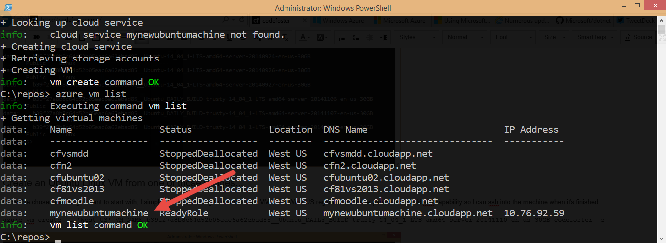 Now let’s fetch a list of my VM’s and see the new mynewubuntumachine in there…