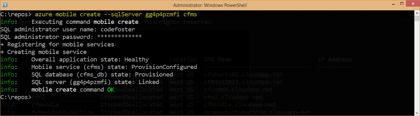 azure mobile create --sqlServer gg4p4pzmfi cfms |