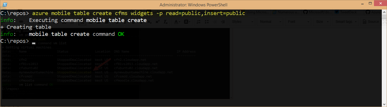 What else can we do with the azure-cli? Oh, man. Glad you asked. Let’s create a quick Azure Mobile Service, add a table, and then use some PowerShell candy to start writing and reading records.