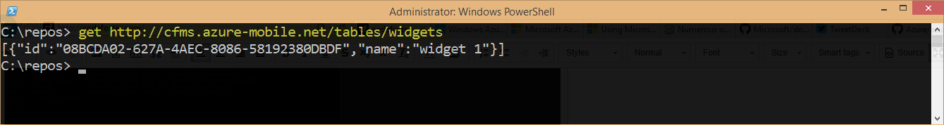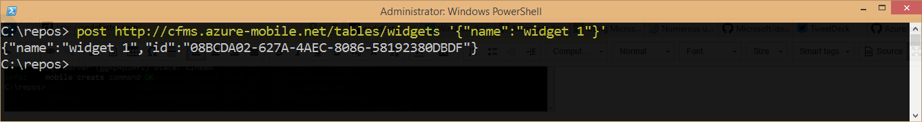 post [http://cfms.azure-mobile.net/tables/widgets](http://cfms.azure-mobile.net/tables/widgets) '{"name":"widget 1"}'; |