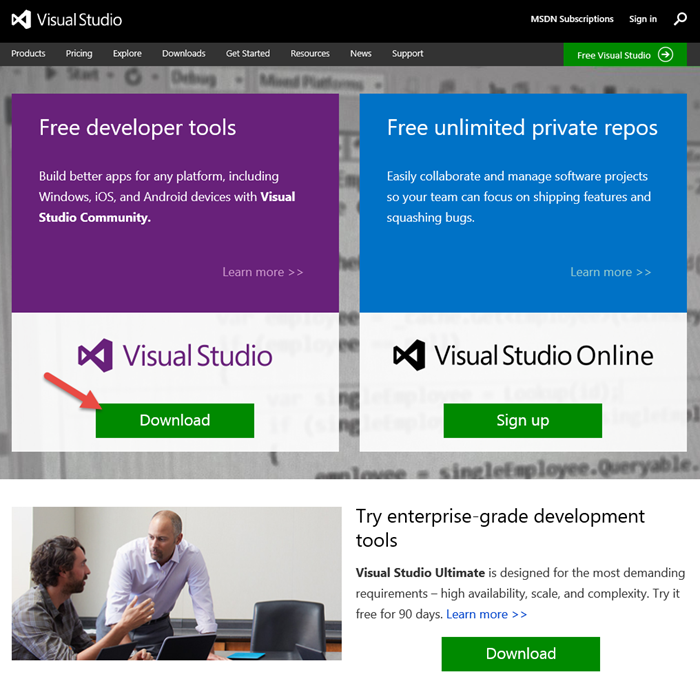To download Visual Studio, start at visualstudio.com, but know that visualstudio.com sort of has two meanings right now. Visual Studio is the IDE, but it’s also the ALM tools for taking any size projects from conception to completion with any size group of developers. So click the download button under Visual Studio the IDE and (at least at the time of this writing) you’ll get a direct link to the Visual Studio Community 2013 package.