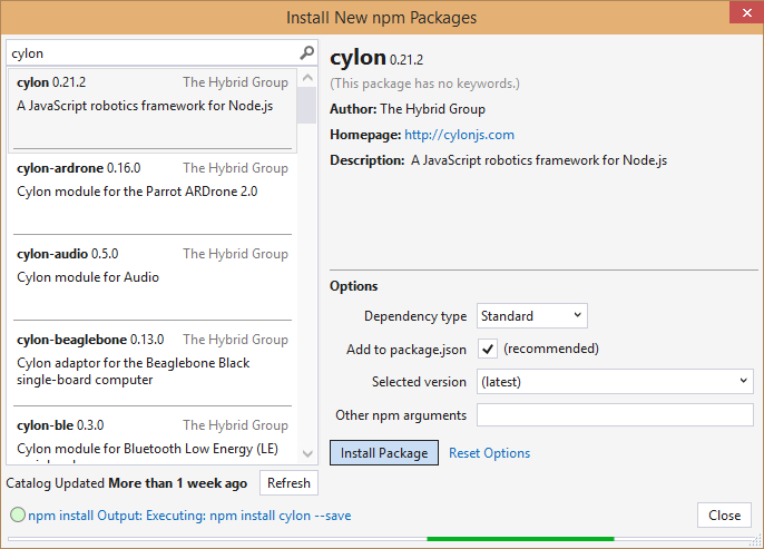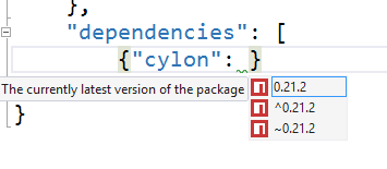 If you begin typing a dependency directly into the package.json, it gives you some Intellisense with an under-the-covers search of the npm repository, and it even helps you with the version…