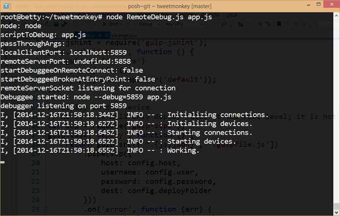 Ideally, I’d have another gulp task for executing the Node.js project on the device, but I haven’t quite figured that out yet, so I just SSH to the device and run it.