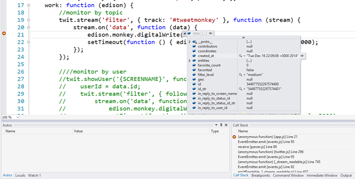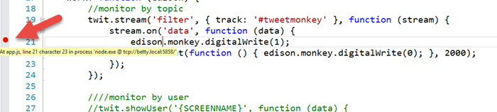 { track: '#cfmonkey' }in the app.js that you need to change the value of. This is what the search is going to look for. This is not looking for tweets from a user actually, but rather looking for tweets with certain text in the body. I will try to update the GitHub repo with comments for how to search for tweets to a certain user. - The code in the app.js is hooking into Twitter’s “streaming API”. This means that you don’t have to poll the service every second to see if any relevant tweets have landed yet. Rather, Twitter will look for them and when one does land, it will call the your code’s function. That’s a thing of beauty!