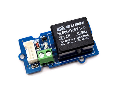 I got this relay from a Grove Seeed Kit (intentionally misspelled). The nice thing about this kit is that it makes all of the components easy to hook up. The white 4-pin connector you see on the component fits a bundle of wires that also comes with the kit and again into an Arduino-compatible shield, which you’ll see next.