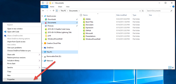 So you just right click on the Documents folder in Windows Explorer (here I’m finding it in my Quick Access list on the left) and choose Properties.