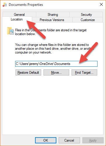 Then you go to the Location tab and change the path. To move your documents to the cloud you simply configure a path that is somewhere in your OneDrive folder (by default in c:\users{user}\OneDrive).