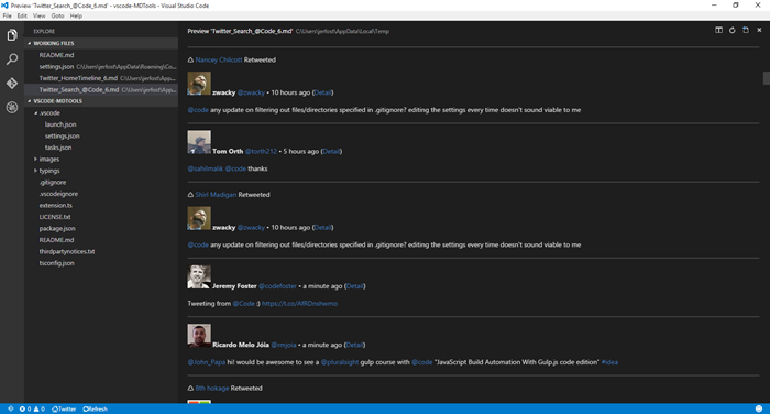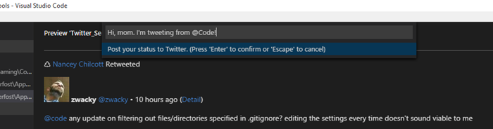 This one’s just cute and fun and shows off the power and versatility of extensions in Code. The Twitter extension let’s you read and even write