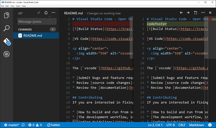 You’ve got it now. So I just added “codefoster” to a readme.md file to simulate a change and then hit CTRL + SHIFT + G to switch to the Git source control section of VS Code, and here’s what I see…