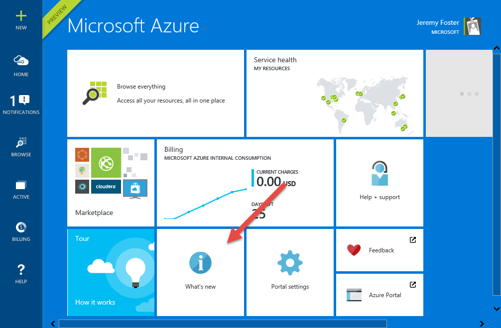 Sometimes it’s the most obvious things that are the easiest for me to miss. I can see being in a usability study with the folks that designed the new Azure portal and giving feedback like, “you know, this is great and all, but it would be really nice to get some visibility into what sort of functionality is getting added to this portal as it’s added”. I can see the designers ripping off their white lab coats in frustration, with clenched teeth and fists, muttering “it’s right… there… and it’s huge!”