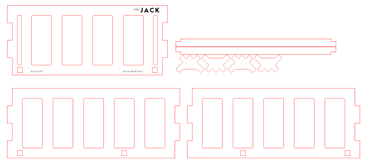 Now, here are the designs I made in CorelDRAW to bring that to life. The laser cutter will translate the red lines as cuts and the black as rasterized etching, so we should end up with a piece cut out that has some personalized, burnt-in images with Jack’s name, the date, and the attribution to daddy.