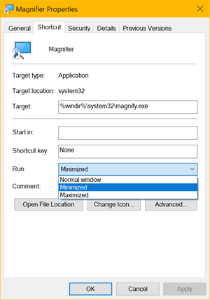 Now right click on the Magnifier icon, right click on the Magnifier entry in the context menu, and hit Properties.