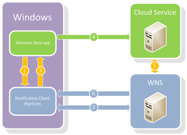 The green is you and the blue is Microsoft. You are writing an app and you are responsible for a cloud service to communicate with WNS.