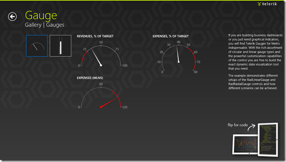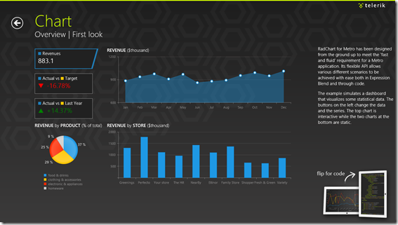 If you haven’t seen Telerik’s Windows 8 controls, you should check it out. Just go to telerik.com and install the trial and then open the demo app (there’s one for HTML/JS and one for XAML/C#) in Visual Studio and launch it.
