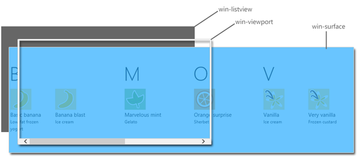 .win-viewport is the viewport of my ListView. If you work with the ListView much, and haven’t seen it already, you should definitely check out Styling the ListView and its itemsfrom the Dev Center. In that article, it breaks down the components of the ListView so you can have a shot at knowing how to style it. Here’s how it visually defines the win-viewport…