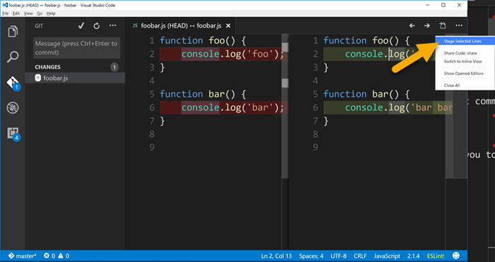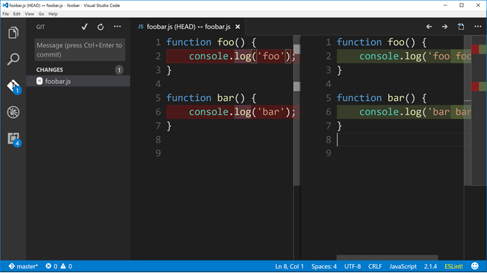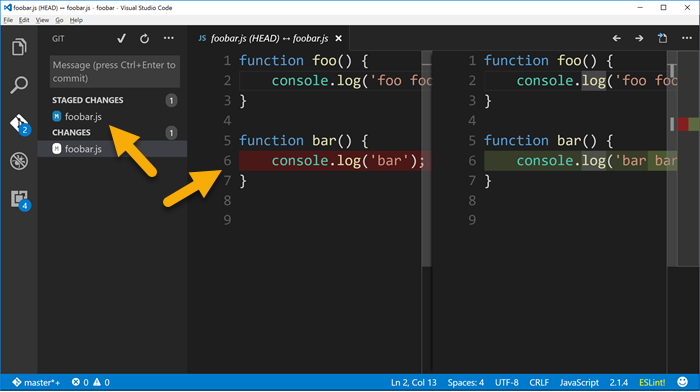 Now let’s say I end up editing both of the functions in that file, but these changes are unrelated to one another. I simply changed foo to foo foo and bar to bar bar. Let’s look first at using the command line to take care of business here, and then we’ll try it with Visual Studio Code.