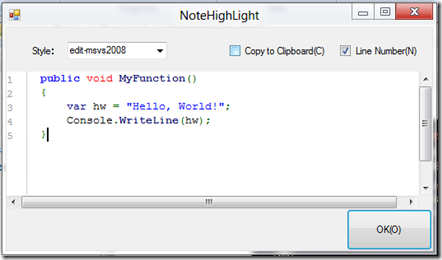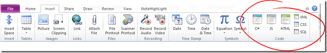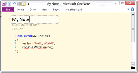 But I’m a software developer and I write a lot of code. Sometimes I just jot down little pieces of code. So I went looking for a syntax highlighter that worked in OneNote. I found it. It’s called NoteHighLight and it’s on CodePlex (here). The installer is in an asian font, so it was a blind install for me, but just choosing the default button on each page of the install wizard worked fine.