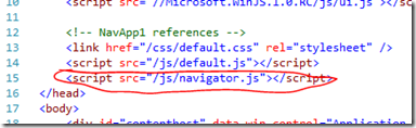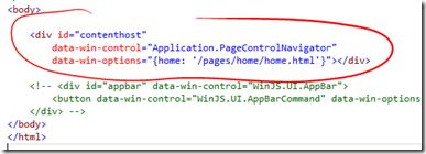 Note: the `data-win-control` makes this an official WinJS control. The data-win-options "home" property tells this control which page to start with and which page to return to when the user elects through the navigator to go home.