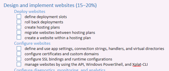 So I start by asking myself if I know what a _deployment slot _is. I don’t. I Bing it and find something like this Staged Deployment on Microsoft Azure Websites article that does an excellent job of defining the term and goes on to discuss the next point roll back deployments as well. So I read up, try it myself, grok the concept, then check the boxes. Simple as that. Notice I said that my study process is simple. The concept aren’t always, but then that’s one of the reasons I like software… it’s complicated!