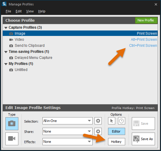 First, I removed the PrtSc hotkey as the default capture key. This is not done in the profiles window, but in the main preferences.